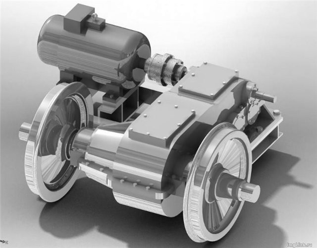 Тихоходным валом редуктора служит ось колесной пары, подшипники которой смонтированы в буксах, установленных в специальных проемах металлоконструкции рамы тележки.